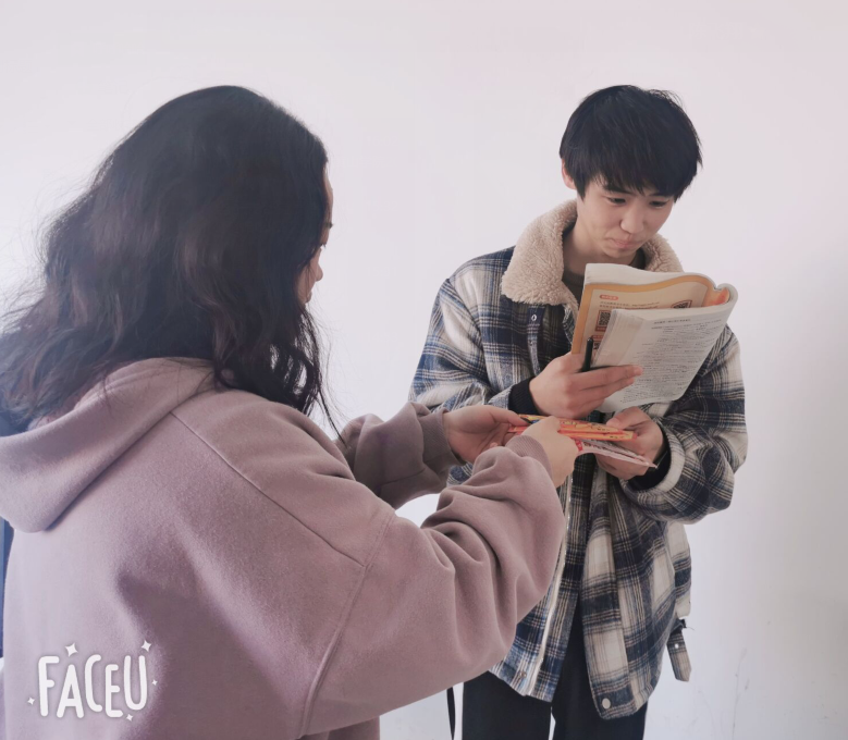 本次活动对象为散布在教室外面各个角落的考研学生。同学们利用课余时间,两两组队,默契配合,积极参与,将暖宝宝和文具袋一并送给在楼梯旁默默刻苦努力的考研学子们,和他们一起合影留念,也送出了自己的祝福“万事如意,沉着应考,超常发挥”。希望学长学姐们都能如愿以偿,成功上岸。他们也真切地感受到了学弟学妹的心意,也会带着大家的关心与祝福轻装上阵。